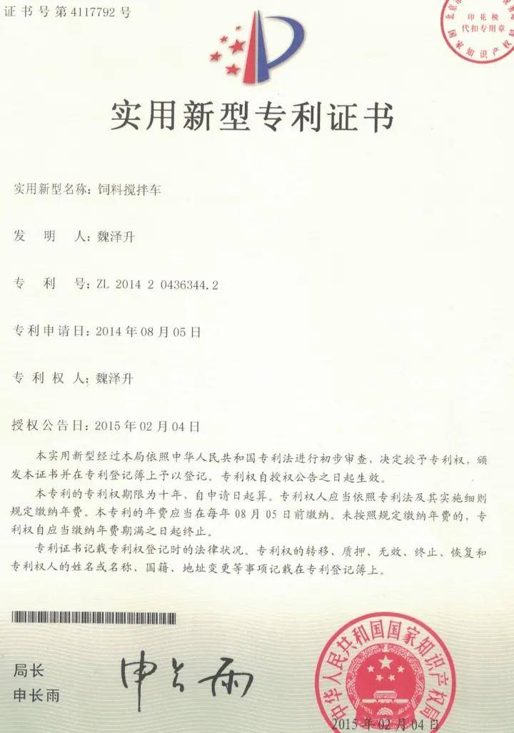 2014年6月,研发了“智能无尘饲料破坏混合设备”并取得实用新型专利认证。