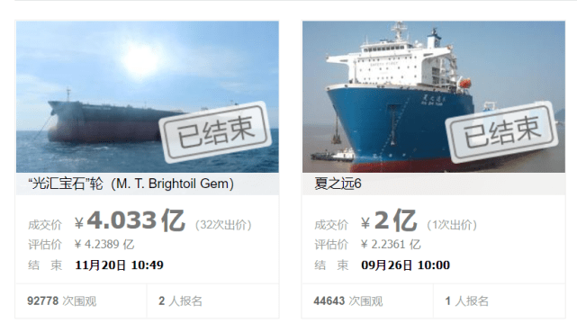现在在阿里拍卖上拍卖成交的上亿船只中,最贵的是成交价4.033亿元的“光汇宝石”油轮,其次为2亿元的“夏之远6”半潜船,两船均是在一拍中顺畅成交。
