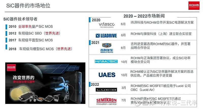 ●2021年,罗姆被UAES(联合电子)公司认证为碳化硅功率器件解决方案的首选供应商,产品被应用于逆变器;