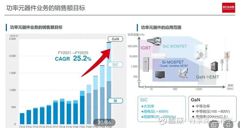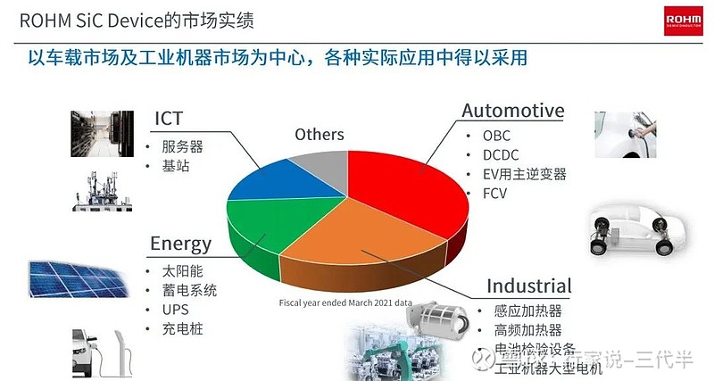 其中,汽车领域、工业设备领域以及计算机和储存设备领域都有20%以上的增长。碳化硅方面,汽车跟工业两个市场占罗姆碳化硅业务的60%-70%,今后太阳能、储能、UPS、服务器、基站、通信业务的展开也是罗姆着力推广的新方向。