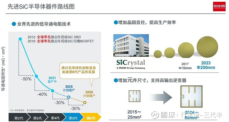 另外,我们将增加晶圆的直径,以提高生产效益,把碳化硅器件的成本持续降低,2017年罗姆全面进入6英寸的碳化硅晶圆时代,2023将实现8英寸衬底的量产。
