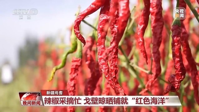 眼下,新疆巴州焉耆县的14万亩辣椒进入采收季,一串串火红的辣椒缀满枝头,栽培户抢抓晴好气候进行辣椒采摘、暴晒作业,田间地头呈现出一派繁忙的秋收现象。