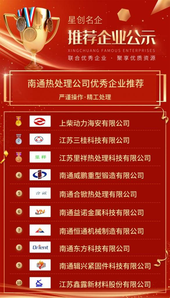 【星创名企-优秀企业引荐】为了促进企业健康开展,发挥优秀企业在职业界的领导效果,首选好商家旗下所属的的综合性企业服务渠道——“星创名企”,凭仗其专业抢先的技能实力,公平公平的活动准则,全力策划发起了由我国各省市优秀企业商家参加的“星创名企”优秀企业引荐活动,此项活动旨在将我国各个职业界的优秀企业聚集在一起,经过搜集广阔网友对企业支撑数据,选出了南通热处理公司优秀企业,现将对征选成果予以公示: