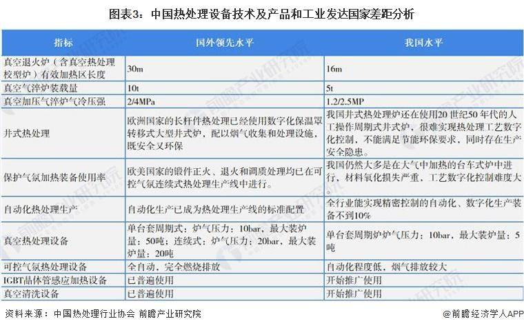 根据中国热处理行业协会发布的《中国热处理行业“十四五”发展规划纲要》,“十三五”期间,我国热处理装备和工艺材料制造已基本达到或接近国际领先水平,但较发达国家仍存在差距,主要体现在功能不够全面;设备稳定性差,热处理工件质量的离散性大;信息化程度低;关键指标未能达到高端设备标准,工艺落后;产业线集成能力不够等方面,具体如下: