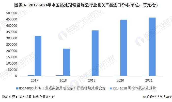 总体来看,2017-2021年我国热处理设备制造业“85144000 其他工业或实验用感应或介质损耗热处理设备”进口价格整体呈下降趋势,2021年为1292.39美元/台;“85141010 可控气氛热处理炉”价格呈整体上涨的趋势,2021年为465214.98美元/台。